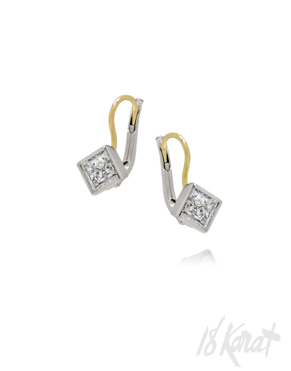 Pam wanted a simple diamond earring, but more interesting than your run-of-the-mill stud. We discussed a variety of styles, and decided on bezel-set princess-cut diamonds, set point-to-point in 18k white gold to emphasize the stones. Because Pam loves yellow gold, we created the ear-wire in 18k yellow gold for contrast.