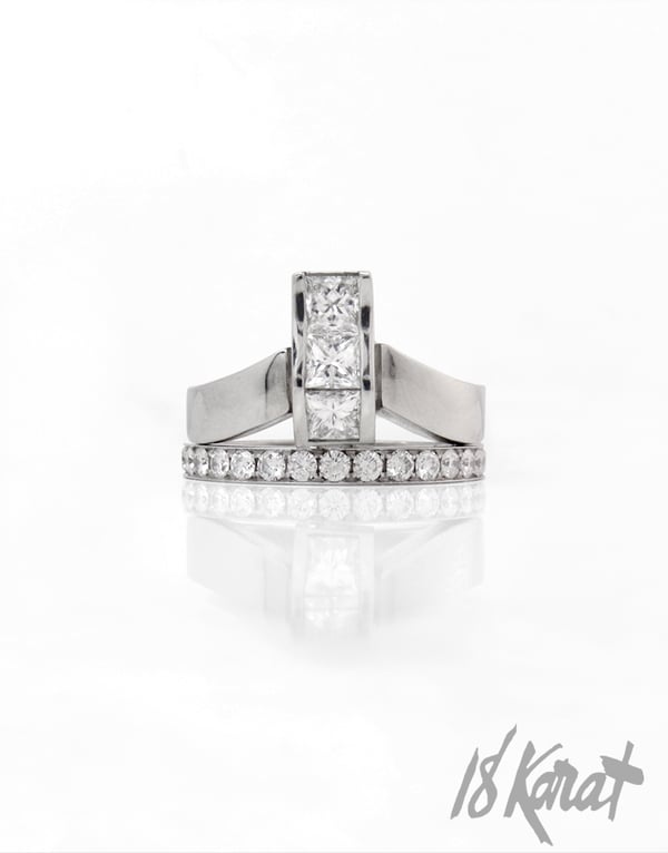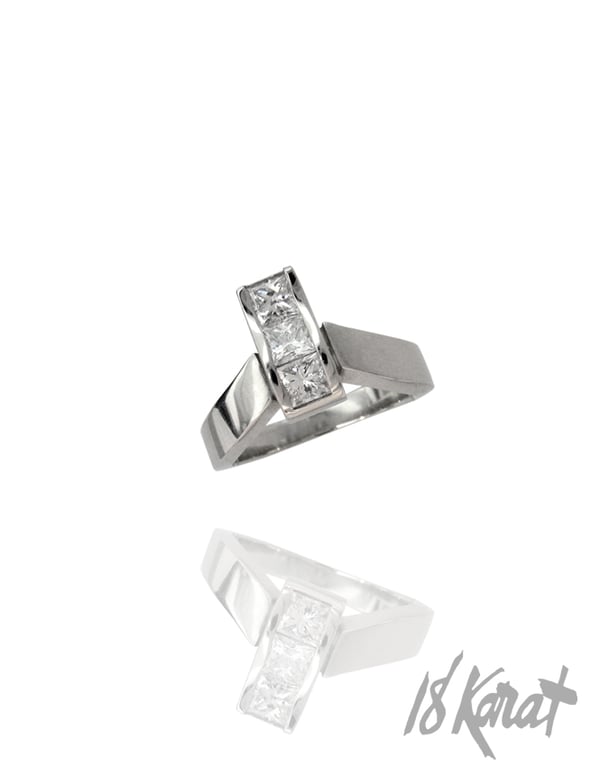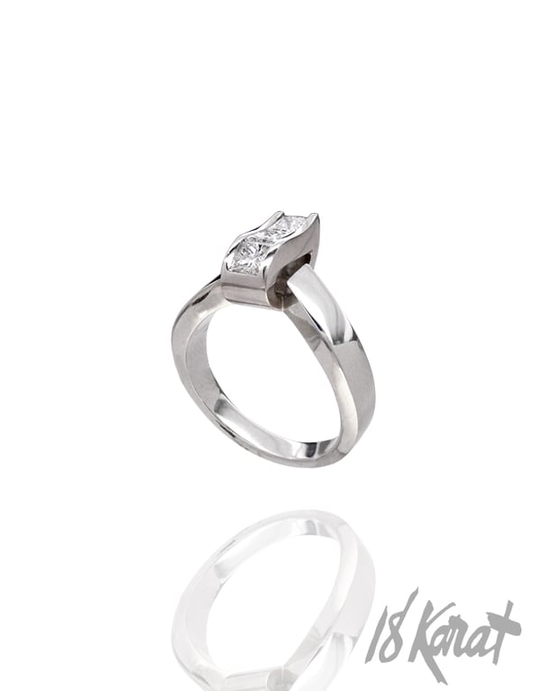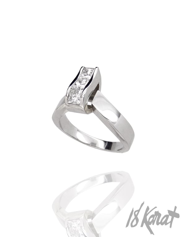 This ring is one of our favourites. If you look closely, you will notice that that sparkling wave, curving up and down over the finger, is actually three square-shaped princess cut diamonds - perfectly matched up, edge to edge, with an angled channel setting. It gives this ring a beautiful ripple-effect, the light hitting each stone at different angles and providing a fantastic sparkling effect.